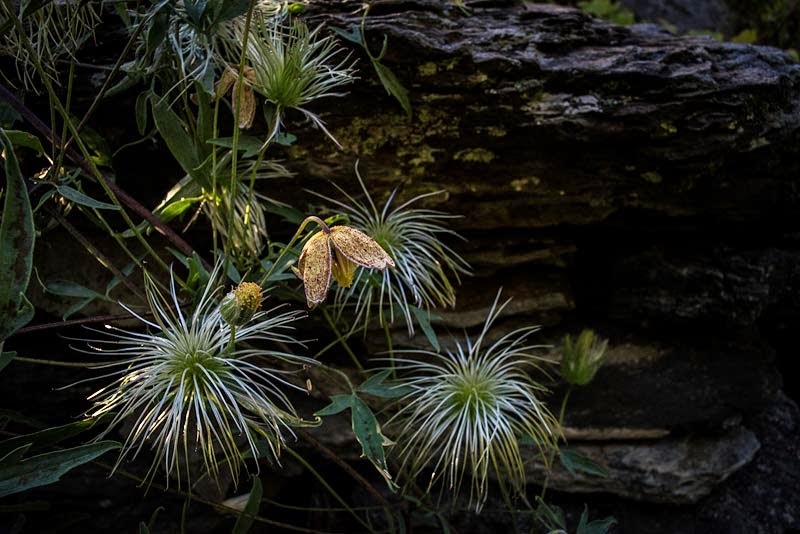 | Clematis ladakhiana: speckled brownish flowers and some of the best silvery seedheads of any clematis. |